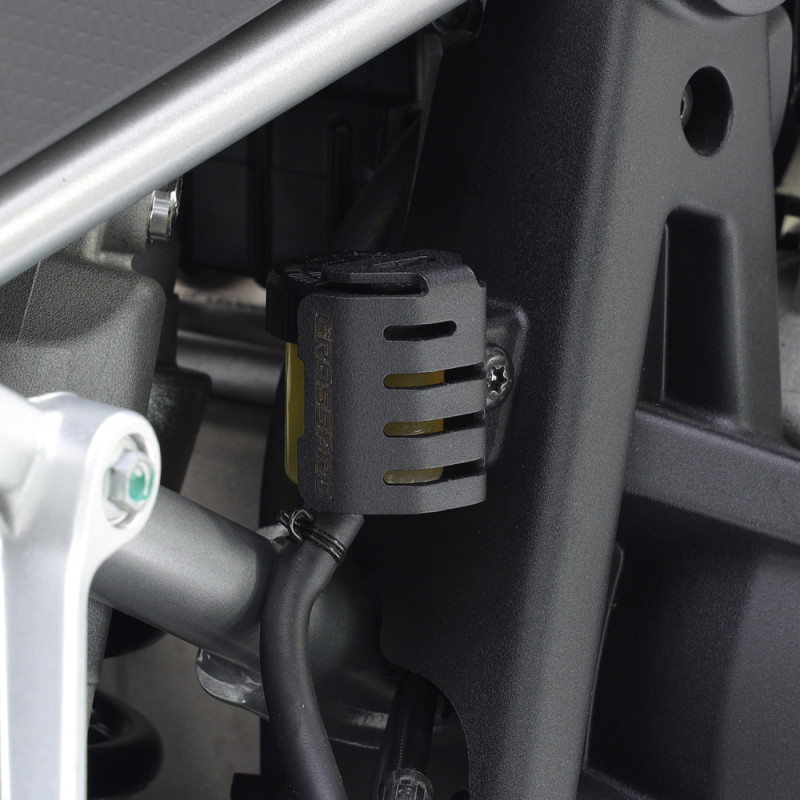 El protector del depósito de líquido de freno trasero de Crosspro previene eficazmente posibles daños al depósito y accesos no deseados a la tapa pero permitiendo ver fácilmente el nivel del líquido controlando su mantenimiento.