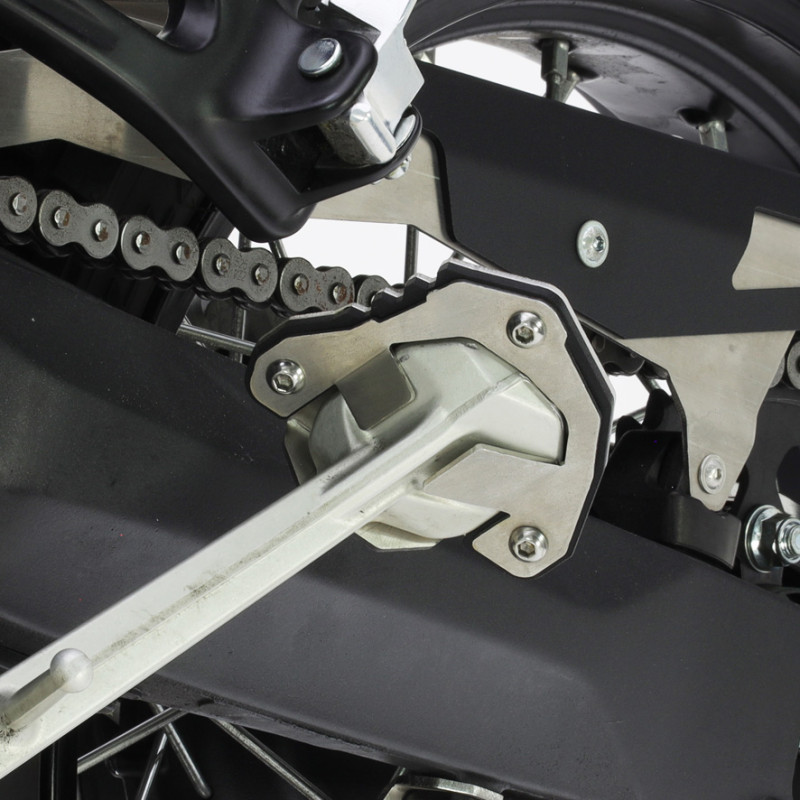 La base de ampliación para el caballete lateral de Crosspro aumenta la zona de apoyo y aporta más estabilidad en terrenos difíciles como arena, tierra o grava.