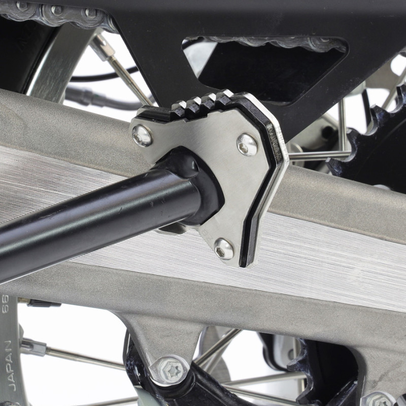 La base de ampliación para el caballete lateral de Crosspro aumenta la zona de apoyo y aporta más estabilidad en terrenos difíciles como arena, tierra o grava.