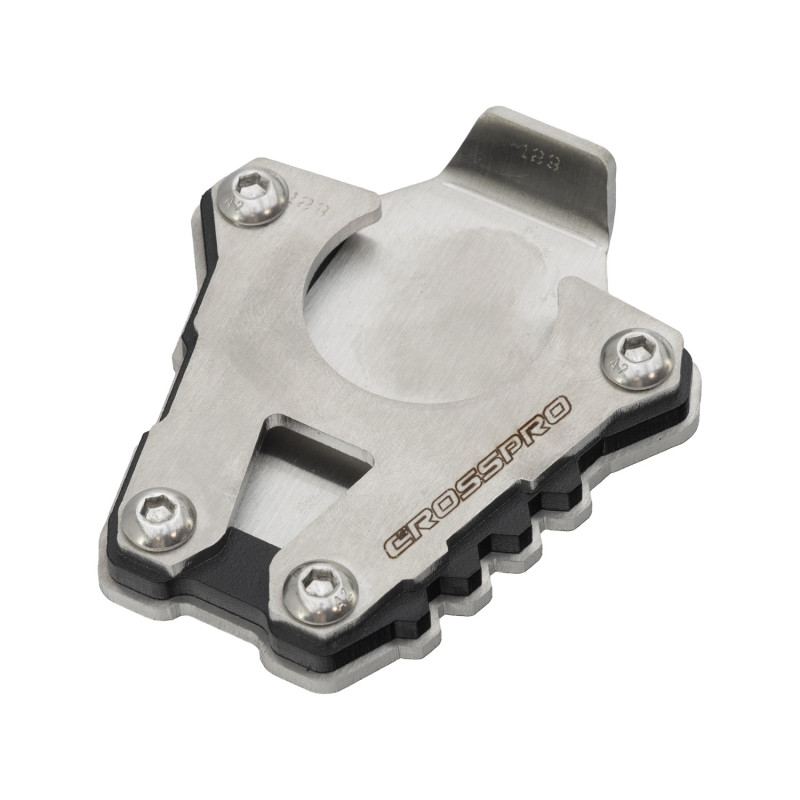 La base de ampliación para el caballete lateral de Crosspro aumenta la zona de apoyo y aporta más estabilidad en terrenos difíciles como arena, tierra o grava.
