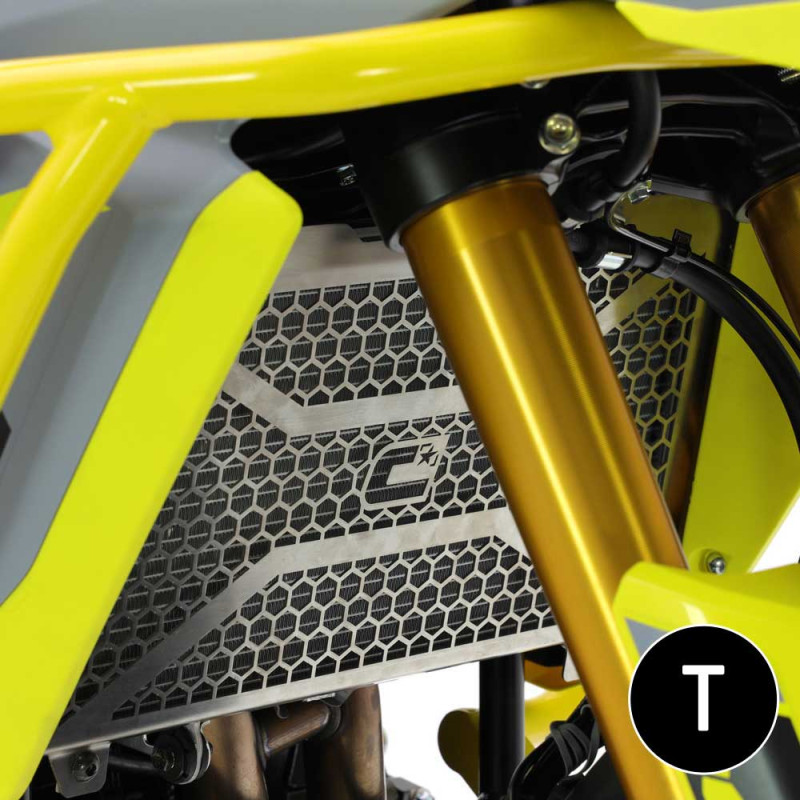 El protector de radiador Crosspro para moto protege el radiador de los impactos de piedras proyectadas por otro vehículo.