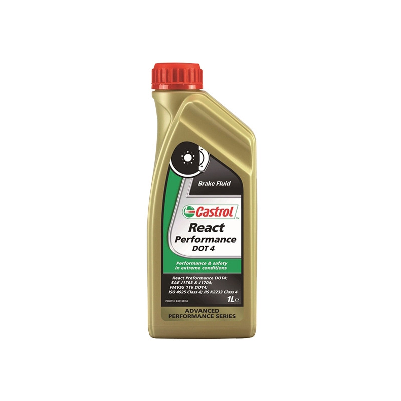 Castrol React Performance DOT4 es un líquido de frenos diseñado para su uso en todos los sistemas de frenos, particularmente, aquellos que esten expuestos a condiciones de servicio extremas tales como vehículos de alto rendimiento y en condiciones de carrera.