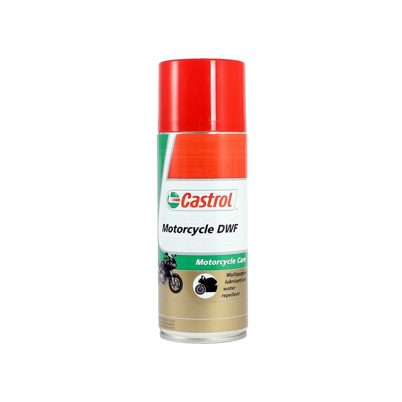 El lubricante para moto en spray Castrol DWF es un fluido deshidratante diseñado para su utilización en motocicletas, automóviles, hogar y talleres. Disponible en aerosol, este producto desplaza a la humedad, penetra en piezas corroidas, limpia, protege y lubrica todo tipo de metales. El envase se suministra con un tubo extensor para lubricar puntos localizados.